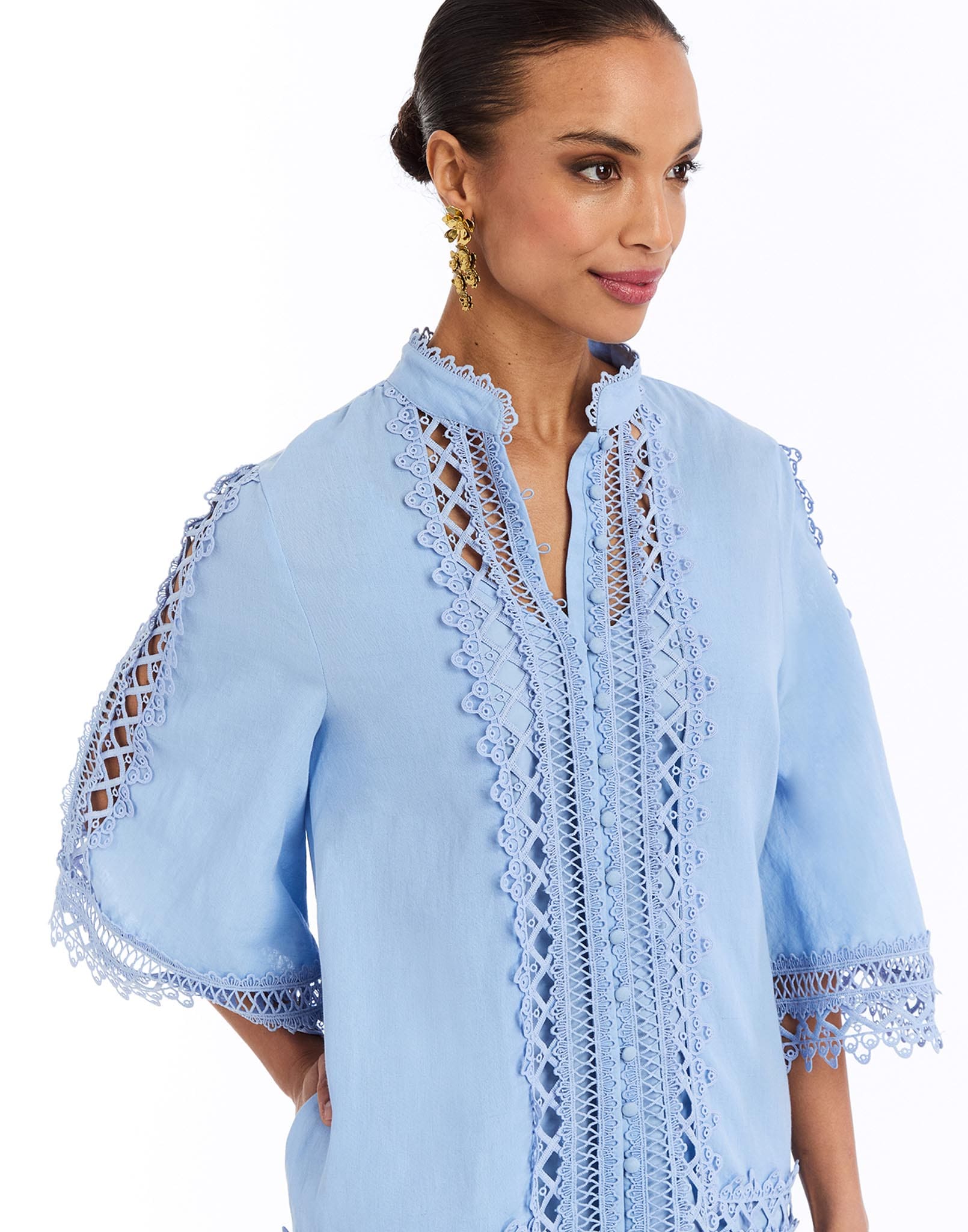 - Lace trims around placket, ruffle seam, collar and sleeve
