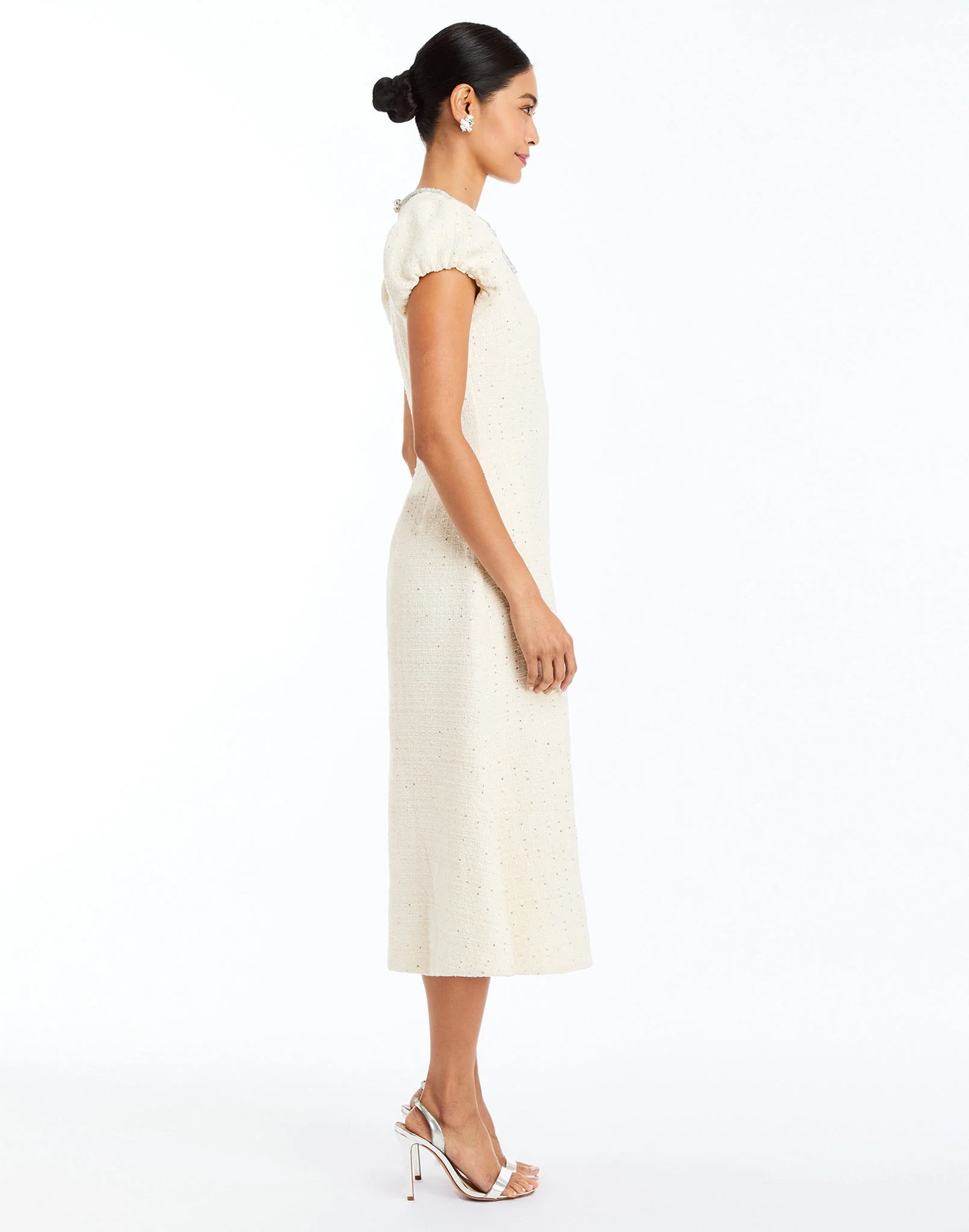 The Perla in Ivory Sparkle Tweed is a timeless bridal silhouette designed for sophisticated celebrations. Crafted in a textured tweed with subtle shimmer, this fit-and-flare midi dress is adorned with a corded rhinestone bow at the neckline—an elevated detail that balances romance and refinement. Perfect for rehearsal dinners, bridal showers, or receptions, this piece captures elegance in every moment.